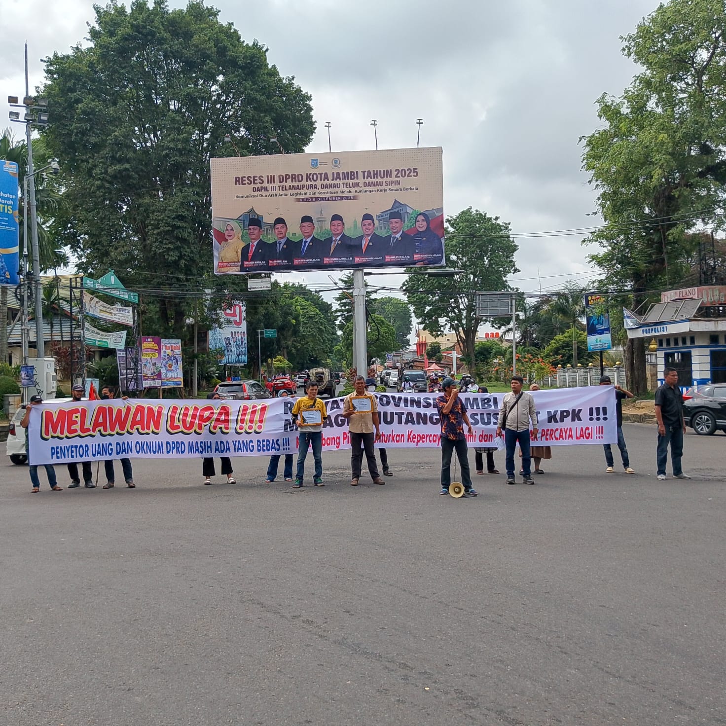 JAMBI, Publiknusantara.com – Puluhan massa yang tergabung dalam Jaringan Pemantau Kewenangan (JPK) Provinsi Jambi menggelar aksi unjuk rasa di Simpang Bank Indonesia, Kota Jambi, Selasa (9/12/2025).