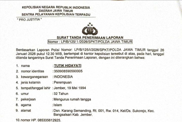 dilaporkan ke Polda Jatim oleh Tutik Hidayati warga asal Sukorejo Bangsalsari Jember melalui kuasa hukumnya Rafly Kurniawan, SH, SE, MM dan Vitalis Jenarus, SH . Terbukti Surat Tanda Penerimaan Laporan Nomor :LP/B/125/1/2026/SPKT/Polda Jawa Timur Berdasarkan Laporan Polisi Nomor: LP/B/125/l/2026/SPKT/Polda Jawa Timur tanggal 26Januari 2026 pukul 12.30 WIB, bertempat di kantor kepolisian Jawa Timur.